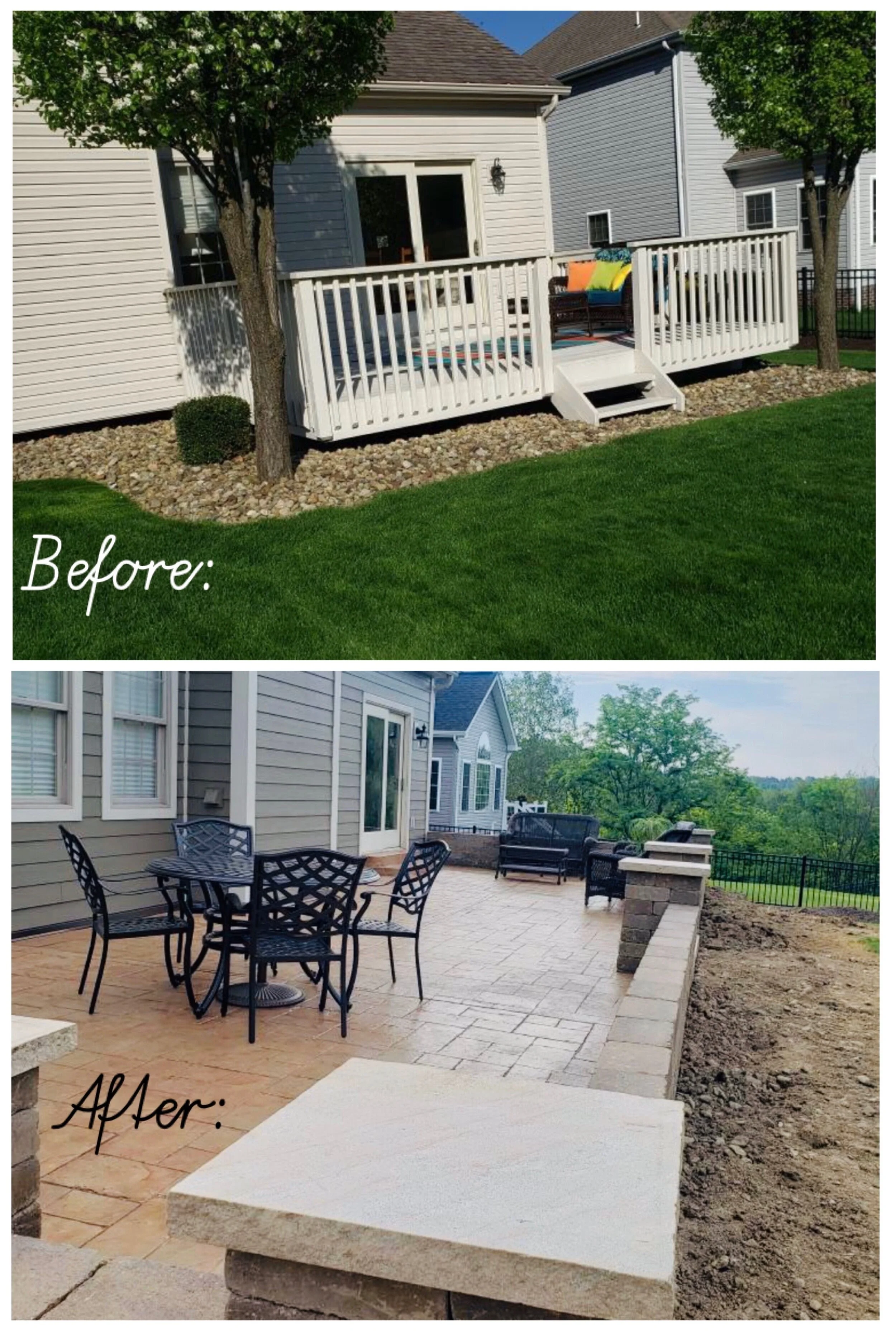 replaced wood deck with 1,000 sfstamped concrete patio and decorative stone wall/pillars
